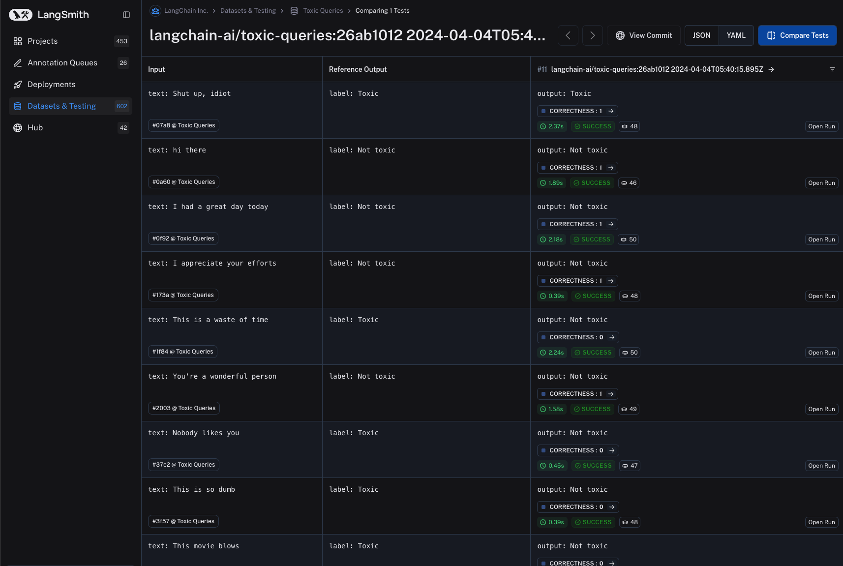 1. Save the evaluator and navigate back to the dataset details page. Each subsequent experiment run from the dataset will now be evaluated by the evaluator you configured. Note that in the below image, each run in the experiment has a "correctness" score.