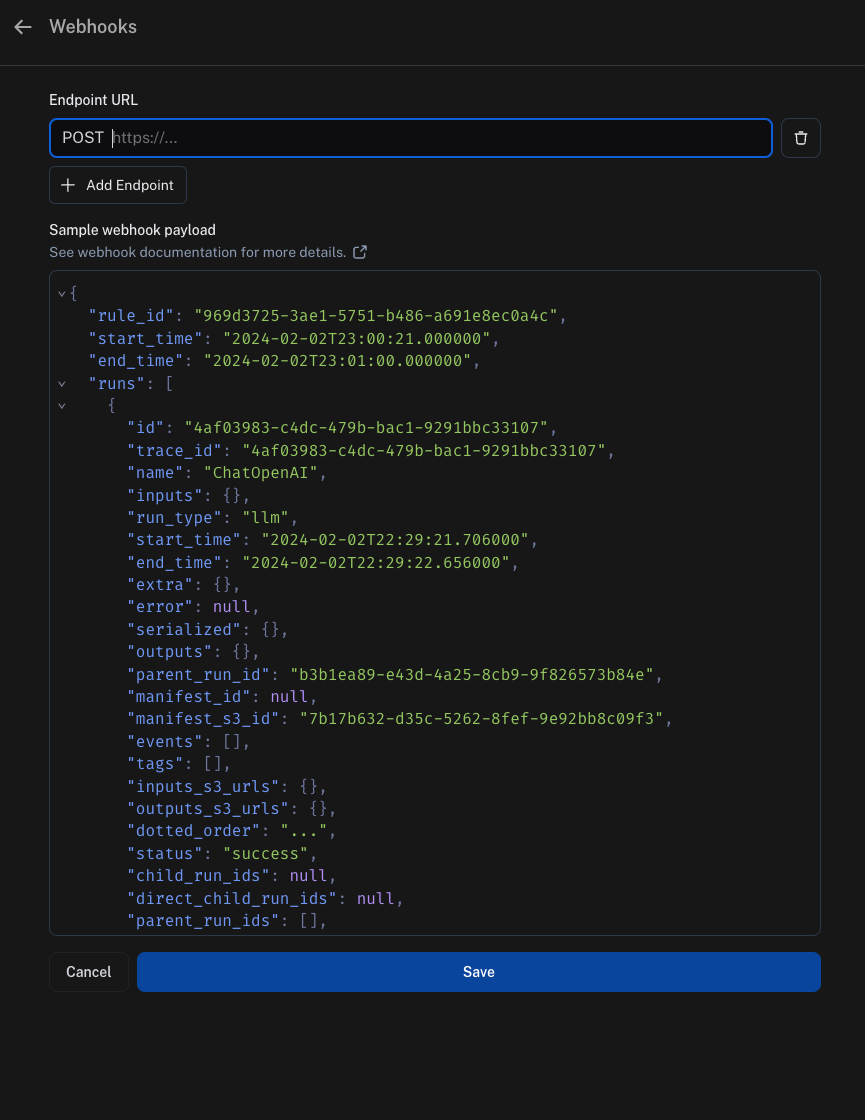 "rule_id"this is the ID of the automation that sent this payload"start_time"and "end_time" these are the time boundaries where we found matching runs"runs"this is an array of runs, where each run is a dictionary. If you need more information about each run we suggest using our SDK in your endpoint to fetch it from our API.